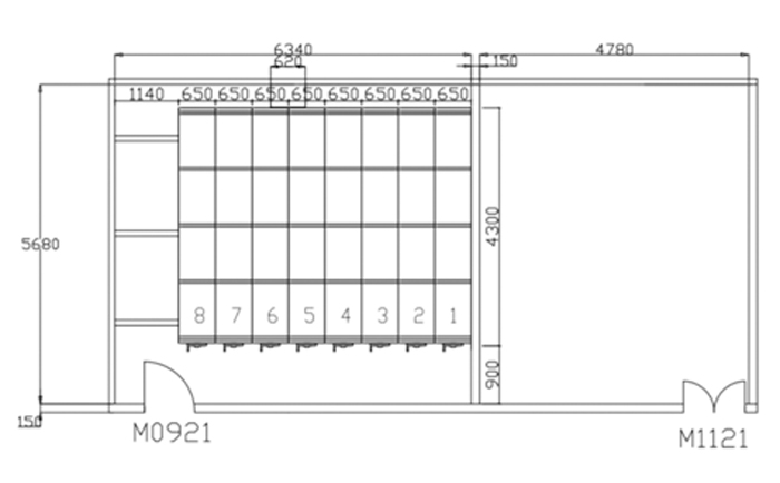 檔案室在三樓,通過現(xiàn)場測量,樓層的承重足夠, 唯一不足的是樓高只有2.2米?蛻粝M軌蜃畲蠡睦每臻g,擺放足夠多的檔案資料。本著合理保留工作空間的原則下,我司告訴用戶密集柜高度可以做到2米(五層)。且提交了如下平面圖設計稿: