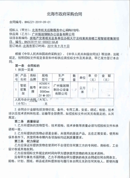 因此想采購一批智能密集架、想詢找廣西或廣東生產(chǎn)密集架的廠家, 并有智能電動(dòng)密集架資質(zhì)的公司2019年8月份進(jìn)行公共投標(biāo),通過激烈的競標(biāo)甄選,最終篩選了我們公司,廣州振越公司生產(chǎn)的智能檔案密集架。